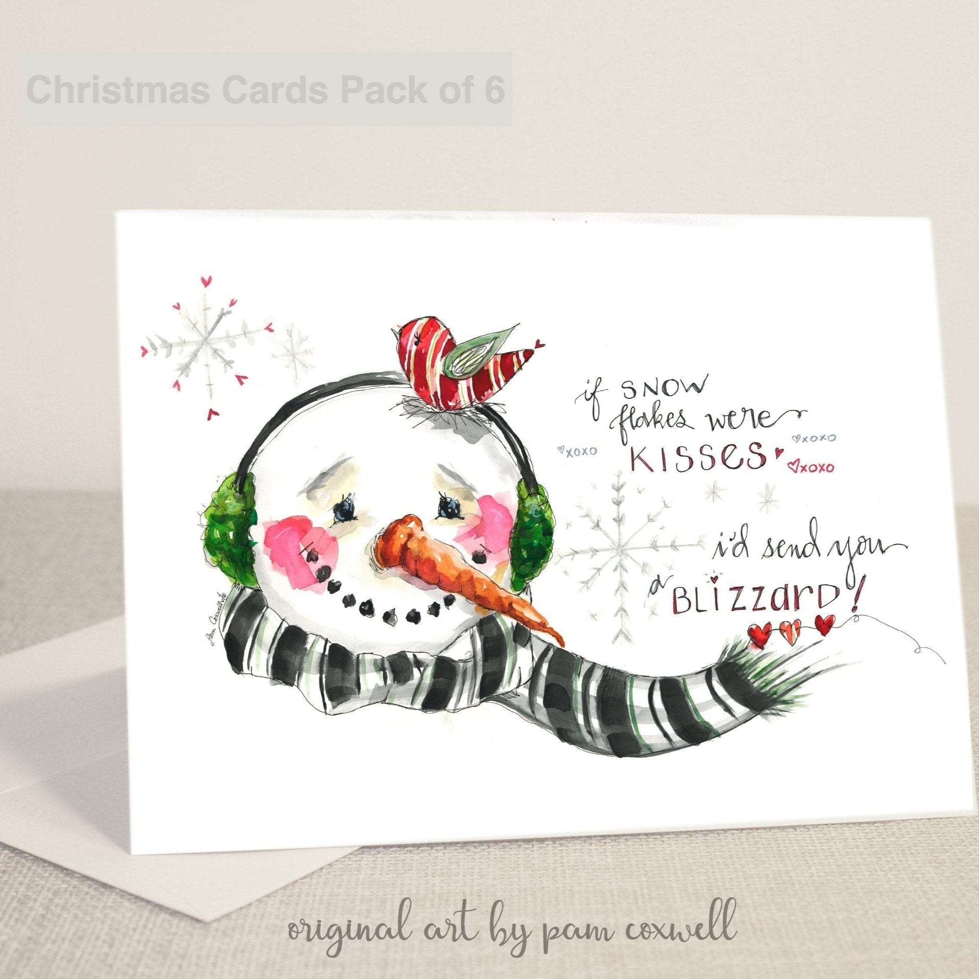 The "Snowman Kisses" is an original design painted by Pam Coxwell using watercolor paint.